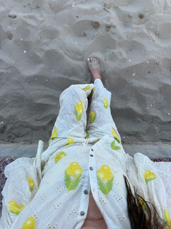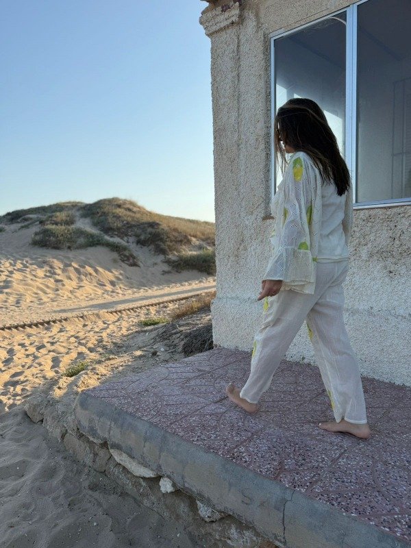 Conjunto camisa con mangas campana y pantalon con cintura elastizada con diseño de limones