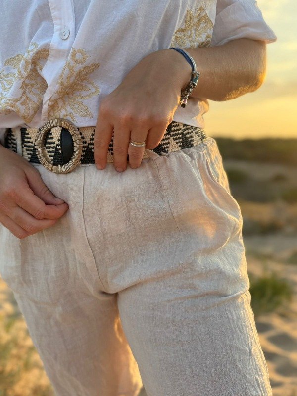 Bermuda de pierna ancha. Su género es lino 100%, cintura elastizada con bolsillos laterales y cinturon
