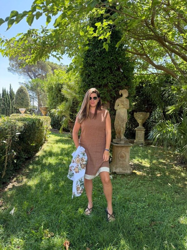 Vestido de lino sin mangas, cuello redondo combinado en el ruedo